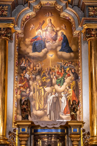 Een schilderij met de afbeelding van Allerheiligen op het hoofdaltaar in de kerk in Ptaszkowa, Zuid-Polen.